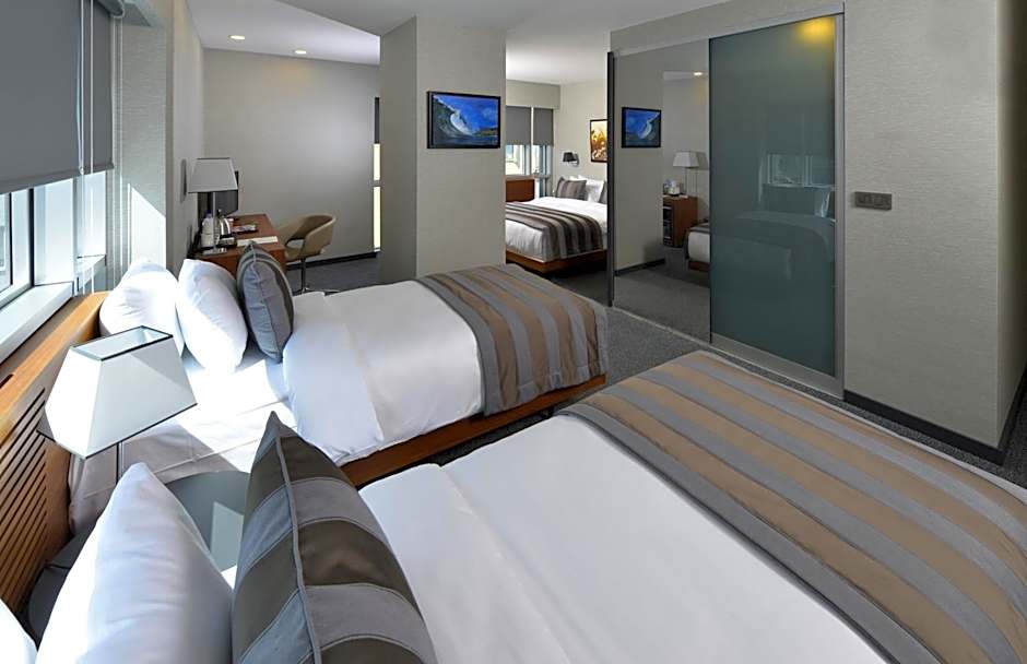 Offering free toiletries, this family room includes a private bathroom with a shower, a hairdryer and slippers. The spacious air-conditioned family room offers a flat-screen TV with cable channels, a mini-bar, a tea and coffee maker, a seating area as well as city views. The unit offers 5 beds.